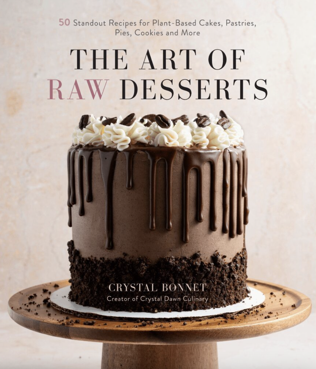 Soaked raw walnuts and cashews, dried golden figs, and hazelnut and almond milk are some of the ingredients that show up frequently in the new cookbook by raw vegan chef and culinary instructor Crystal Bonnet, founder of Crystal Dawn Culinary. Then there’s coconut. Coconut nectar, coconut sugar, coconut milk, coconut flour, dried coconut, coconut meat… Raw cakes are Bonnet’s jam, and varieties like blackberry ginger lime zebra cheesecake, carrot cake with orange cheesecake frosting, and apricot pecan butternut squash cake with coconut cream are eye-catching—if not for the lazy cook.