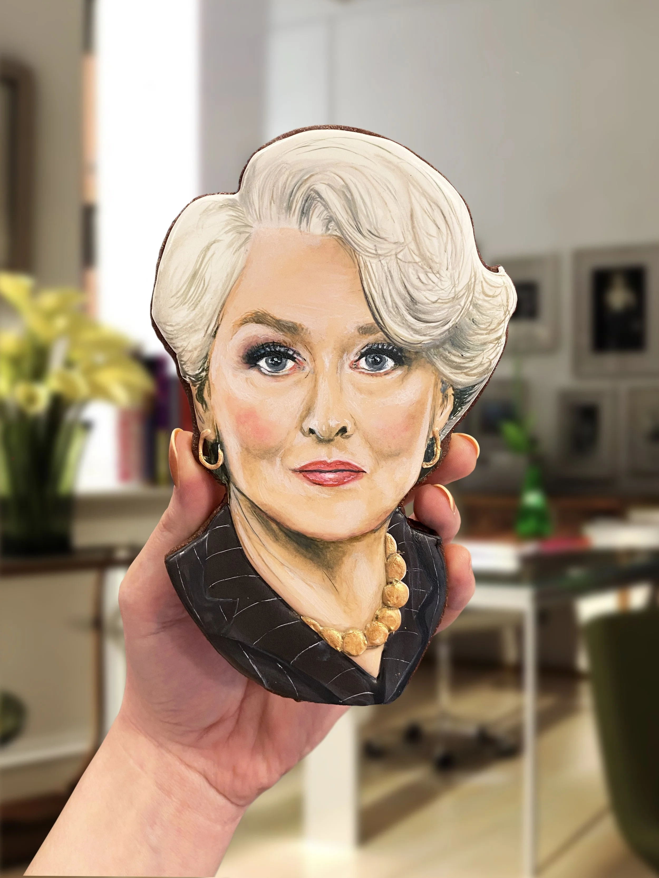 Radcliffe recalls her inaugural portrait cookie (which is what garners the most attention on her Instagram) being a shirtless man on the cover of a romance novel for an author’s book-release promotion, which she drew entirely freehand by copying a photograph. That method of decorating was extremely time-consuming and overwhelming, so since then, the sugar artist has started using a projector to cast photos of her designs onto cookies.