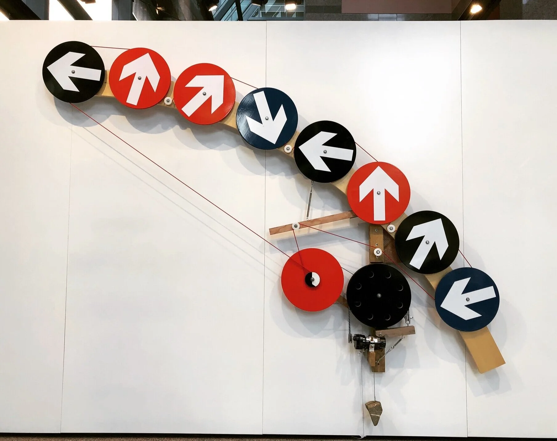 One of the key pieces in the new exhibit emerged from the years of eviction and turmoil. Called Convergence, it features at-first-cheery-seeming black, red, and blue ski-sign arrows that move slowly on wheels. Their system of pulleys is weighed down at the bottom by a rock, akin to gondola mechanics. The arrows point in all different directions, but every five days to a week, all of them synchronize for a single turn.