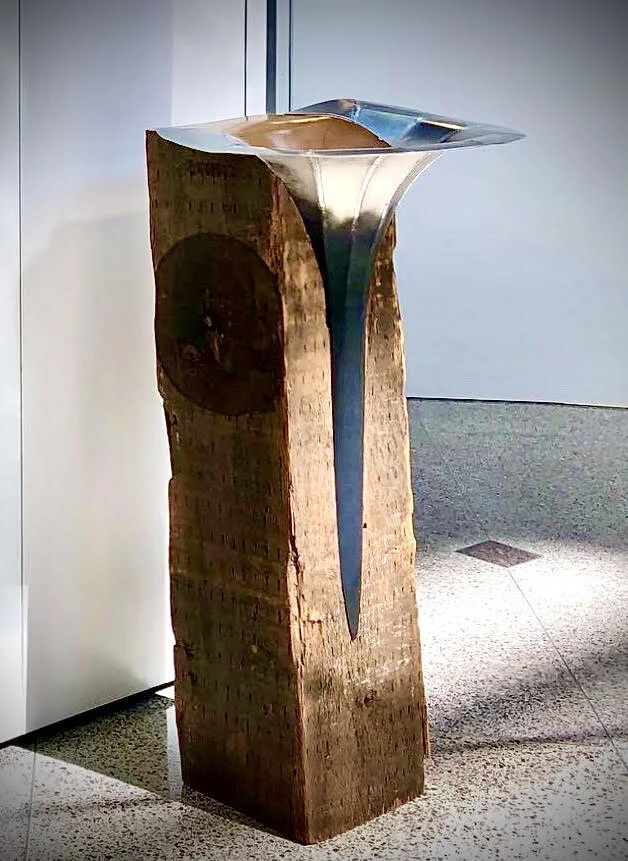 Point of Origin integrates a centuries-old piece of Douglas Fir timber that Storey salvaged from a wharf being dismantled to make way for Expo 86. He first exhibited it in the legendary October Show of the mid-’80s, running it like a post up through three floors of the building for the art exhibition. He later displayed it as part of an installation in Banff, and then used the beam as a work bench in his studio before dismantling it. For the piece here, he pulls the beauty out of the wood, carving down to the centre of the annual rings and fitting it with a gramophone-like aluminum horn; in the “black hole” of its bottom, a wire twitches on the second-hand axel of a clock. Here the dichotomy of Storey’s work is on full display: a whimsically shaped object that invites you to stare deep into the abyss of time and space.
