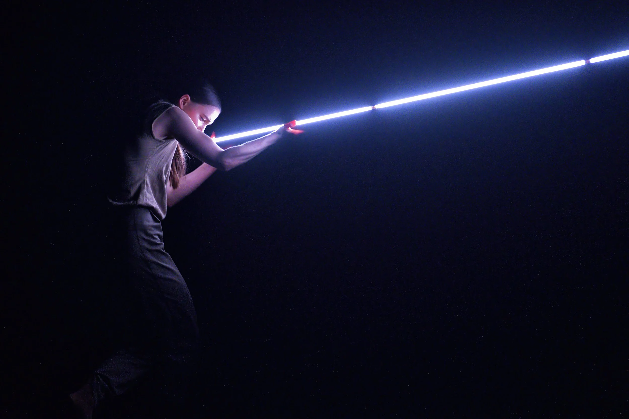 Dancer Anna Bekirova wields a giant glowing rod in Everything will be ok. Photo by Michael Slobodian