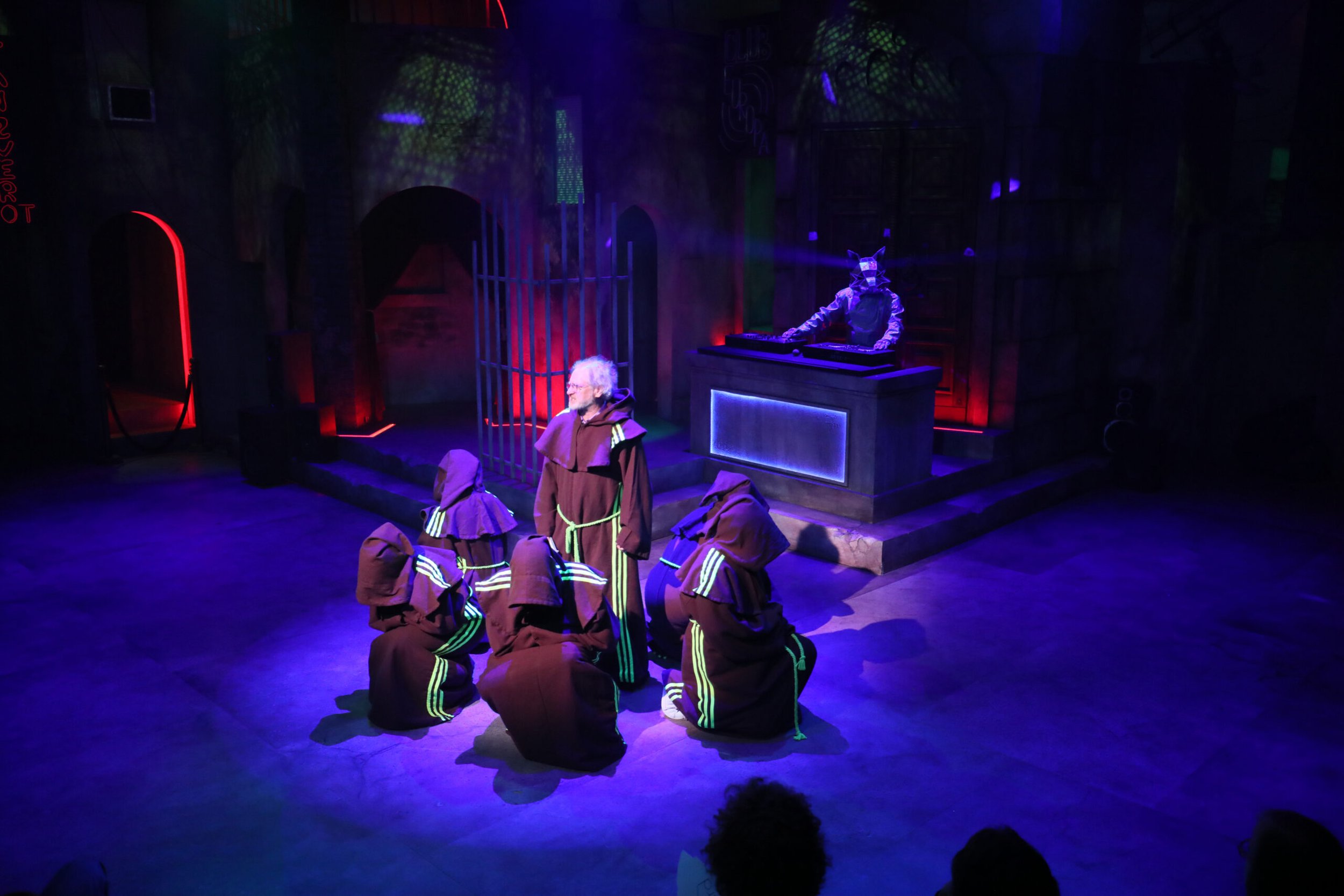 The setup allows for plenty of subversive laughs and pop-culture references (listen for song lyrics interwoven with the Bard’s lines). The absurdity is cranked to 11, costume designer Alaia Hamer outfitting everyone in neon and silver, complete with rave-issue bucket hats, gold chains, and sneakers. Helped by Krystal Kiran’s energized choreography, monks in Adidas-striped robes pop up as a recurring flash mob.