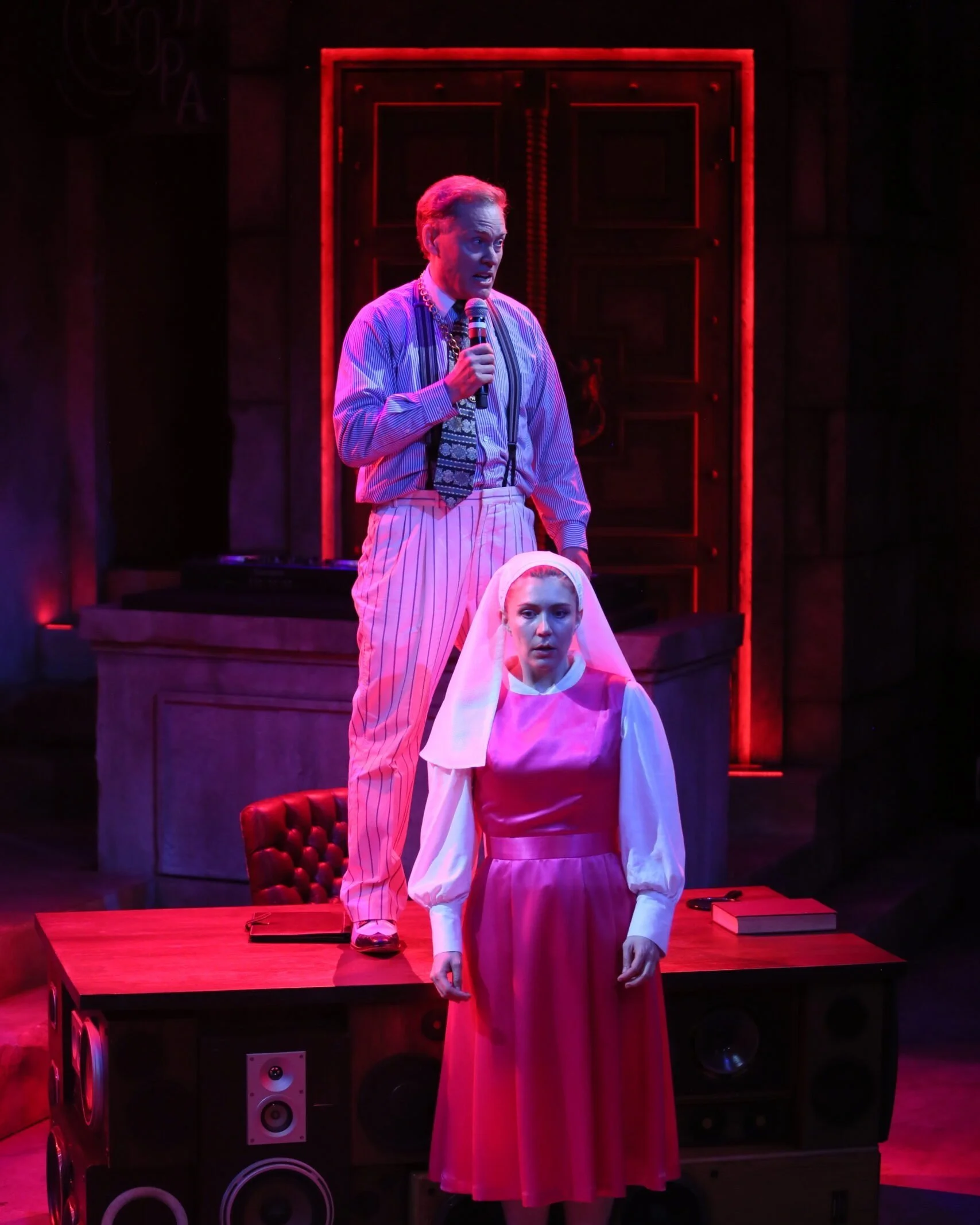 To explain: Duke Vincenzio appoints Lord Angelo to rule a morally loose Vienna, the latter soon trying to turn the city around with strict enforcement of morality laws. In the 1604 original, there’s a crackdown on premarital sex, resulting in imprisonment and a death sentence for Claudio, who has gotten his fiancé, Juliet, pregnant. The hypocritical Angelo propositions the novice nun Isabella when she comes to plead for mercy for her brother, Claudio: if the virginal Isabella has sex with Angelo, he’ll spare Claudio’s life. In this version, it’s dancing and dance clubs that have been banned—and Angelo wants Isabella to boogie with him to save her sibling. There are nods to the absurdity of the setup versus the script: how could the unmarried Juliet become impregnated by her fiancé by simply dancing? “’Twas hot!”