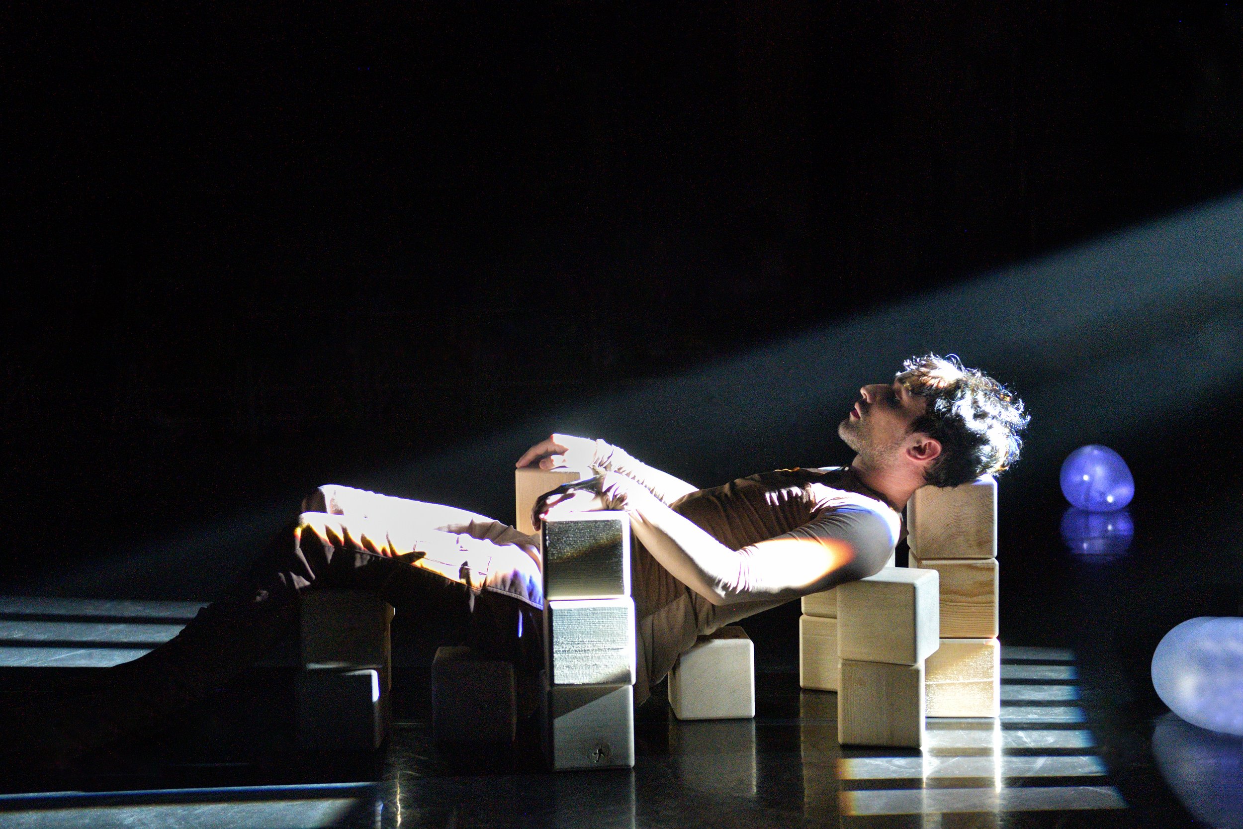 But what the title doesn’t quite convey is what a total, immersive piece of interdisciplinary art this experience is. Choreographer Joe Laughlin invites audience members into a fully realized world of visuals and sound, from the moment they step into a Fei and Milton Wong Experimental Theatre that’s been so fully reconfigured that it’s unrecognizable.