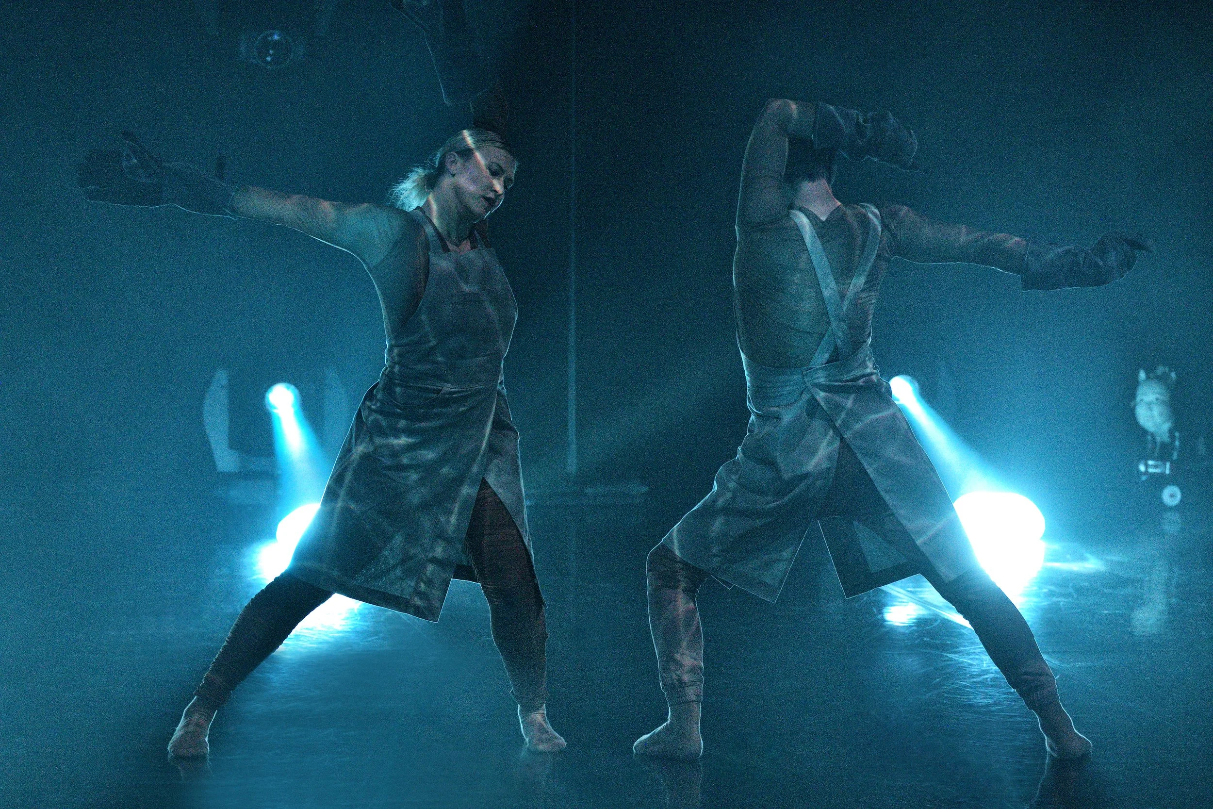 Visitors enter through two doors to a traverse stage, with stadium seating on either side of a galley where the performance takes place. During the show, those doors become eerie, backlit portals for the two dancers.