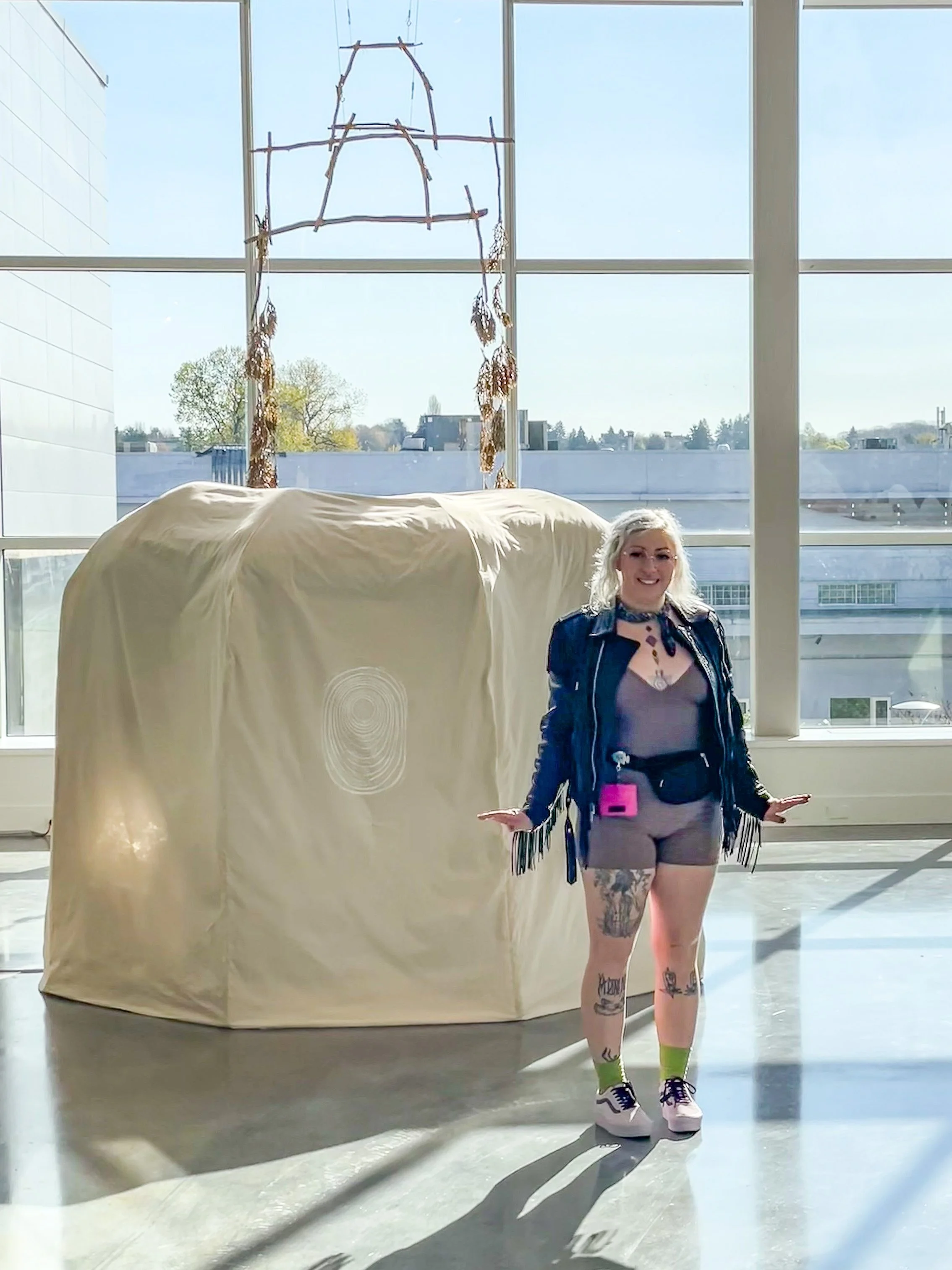 Zoë Laycock, the Anishinaabe Red River Métis artist behind the work, describes it as a nomadic interdimensional broadcast booth.