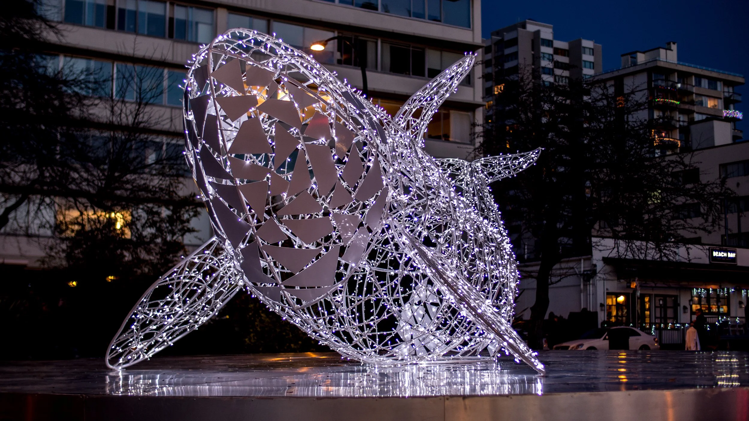 Luna the Whale, one of the lighting installations available for free viewing at Liven UP – Coal Harbour. Photo by MK Illumination
