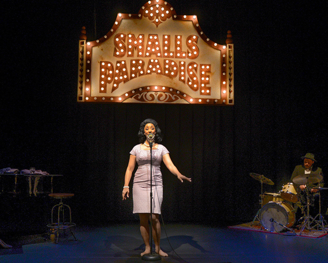 But what may be most interesting about this production is its almost hallucinatory, dreamlike setting. Desmond, near the end of her life on the hardwood floor of her New York apartment, suddenly finds herself performing on the cabaret stage of her old Harlem haunt, Smalls Paradise. Under late set director Drew Facey’s smashing multilight marquee, she reflects back on her life through songs and storytelling.