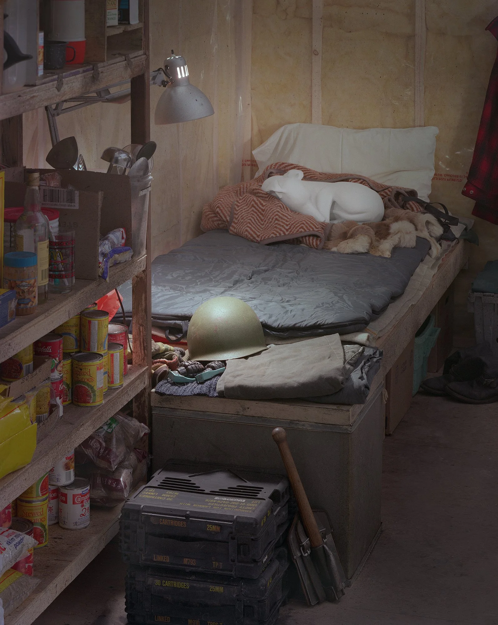 Through ample photos accompanying each think piece or conversation, art fans who have followed the pioneering artist are able to trace the works she’s created through the years. There are the real, old jars of preserves, lining a wooden shelf, in 1976’s Time and Mrs. Tiber (Magor ruminates here on the complex joining of her title subject’s “desire to extend the life of a fruit for the season, to my desire to hold it for a lifetime, to the museum’s desire to maintain it in perpetuity”). There are the neatly organized, lead-cast everyday objects—light bulbs, matches, fishing weights, bread—that measured a woman’s weight at different times in her life. There are allusions to her photography (of Civil-War re-enactors, fresh-faced students, and hippie back-to-the-land-ers) and to large-scale installations—such as 1996’s Messenger, a full-sized one-room cabin outfitted for survival (“Ammunition boxes share storage space with basic supplies such as flour and sugar,” she writes) with a curious plaster-cast dog lying on its bed. Across all the complex works, themes emerge: clothing and shelter; the natural and the artificial; identity, consumption, and history.