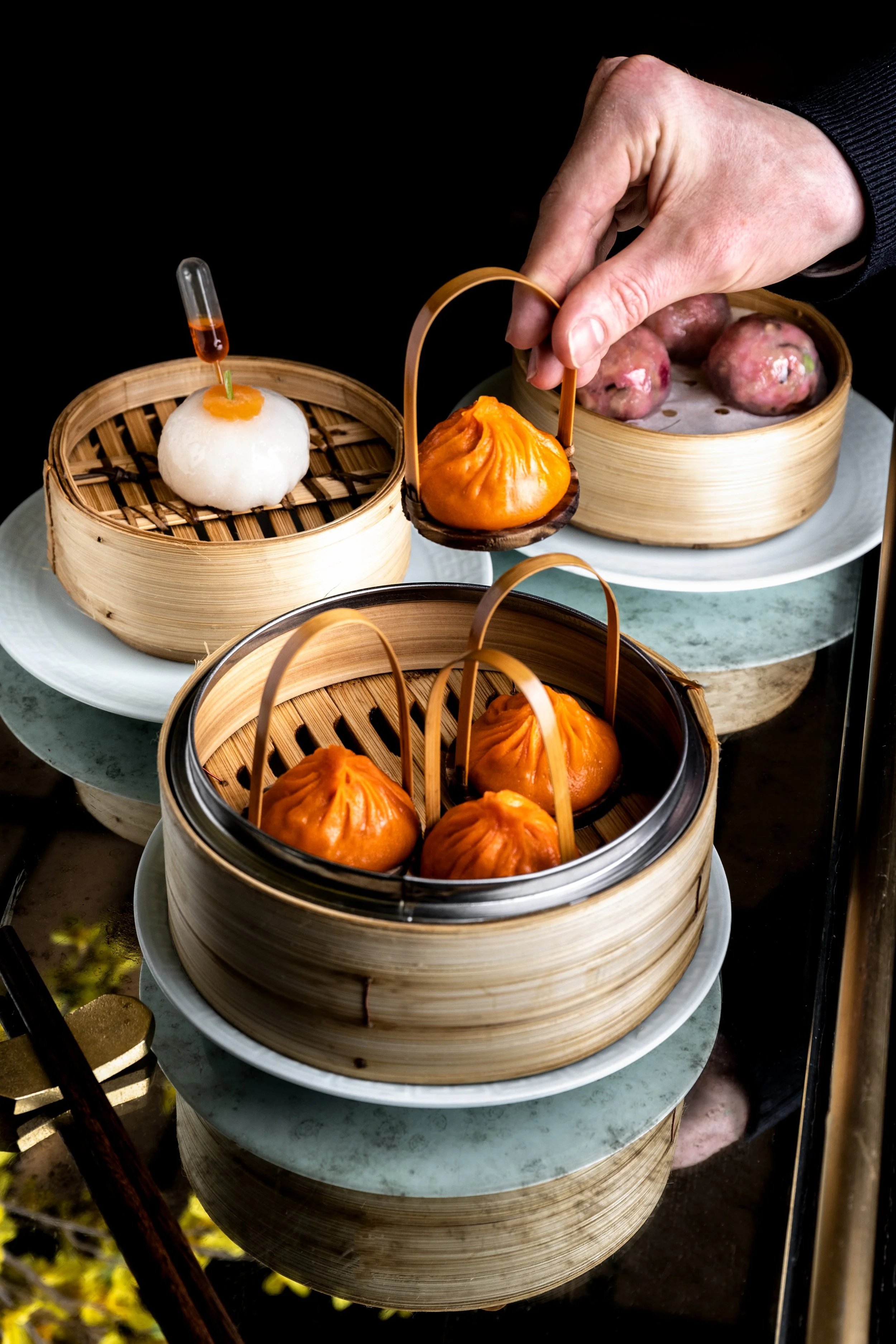 WATCHING MOTT 32 DIM SUM chef Jian Hui (Ken) Li make hot-and-sour Iberico-pork Shanghainese soup dumplings is as mesmerizing as any mindfulness app. He uses his hands to roll out dough (that’s made with carrot juice for a bold orange colour) into a perfect sleek cylinder, then breaks it into one-inch sections that he moves about on a large wooden cutting board, dollops mingling on a dance floor of flour. Moving swiftly, he takes a wooden roller about the diameter of a dime to flatten each piece to the thickness of mere millimetres, then, as one hand continues to roll back and forth, the other shapes the dough into a circle, turning, turning, turning. He fills each one with the ingredients for the restaurant’s most popular dim-sum item and seals the dumplings, still turning, turning, turning, delicately pinching the top in a swirl so they look like blooms that haven’t yet opened up to the sun. You can get lost in this culinary trance.