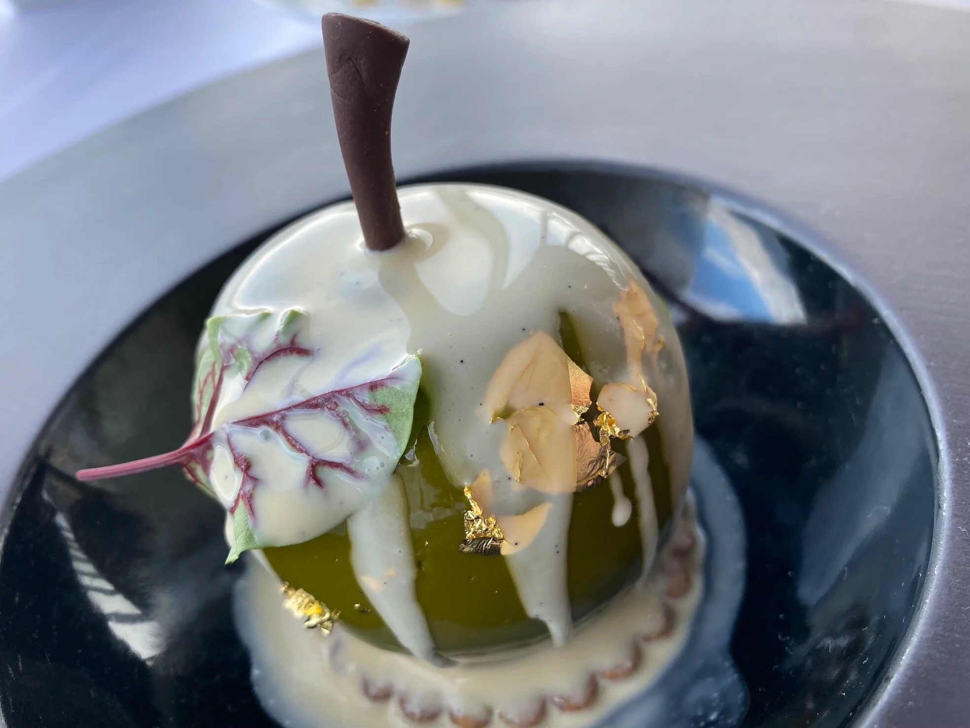 Before vanilla cream is poured over top, Douceur de Pomme Verte comes in a cloche billowing with smoke. Photo by Gail Johnson