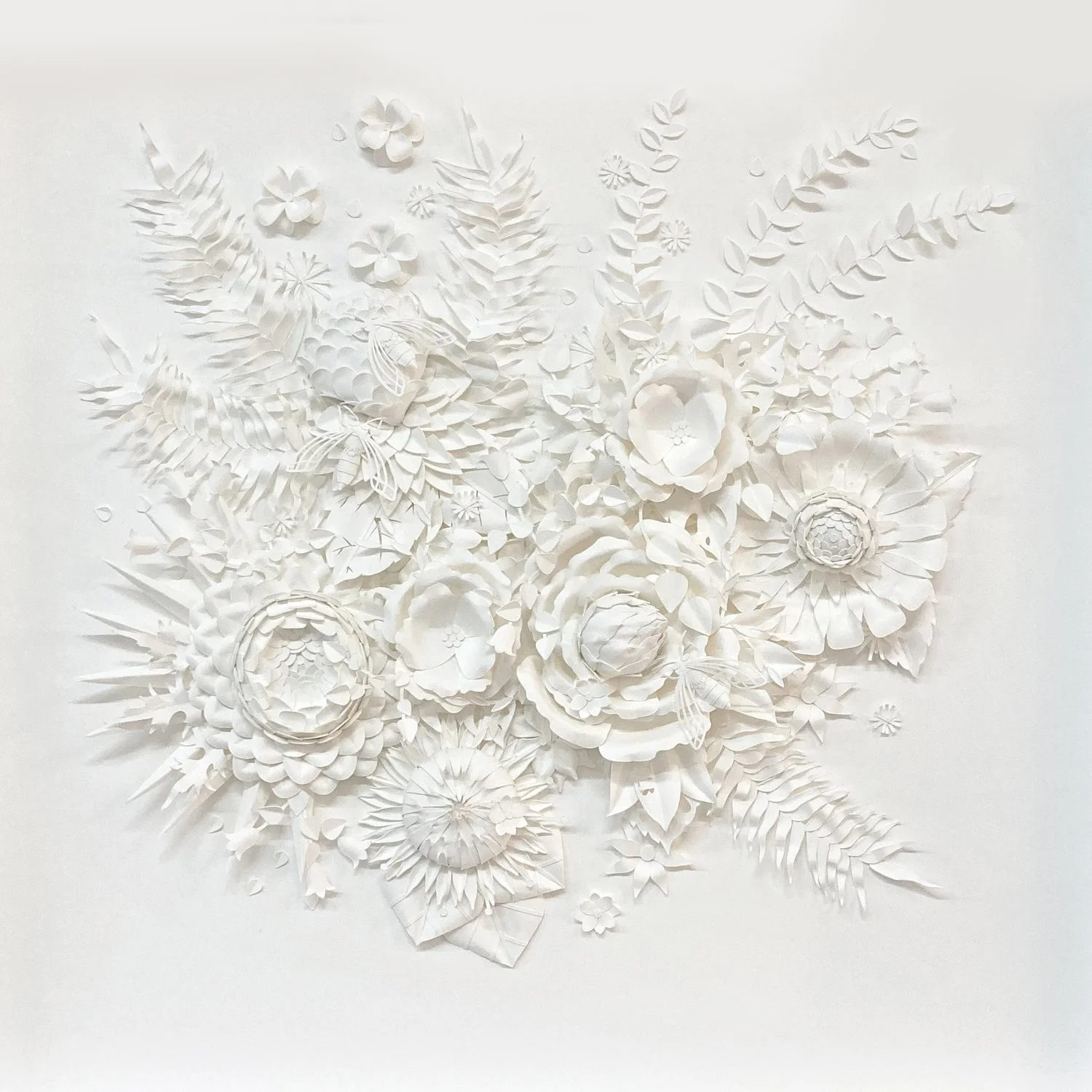 The monochrome aesthetic highlights the delicacy of Bennett’s painstakingly precise and delicate cuts. Hidden within the artwork is a leaf with Bennett’s initials, TLB, marked on it. With an eye to the longevity of her works, Bennett uses fine-art cotton-rag acid-free paper that has been produced in Holland for more than four centuries, along with an acid-free adhesive that was formulated specifically for preservation materials to avoid it becoming brittle with age.