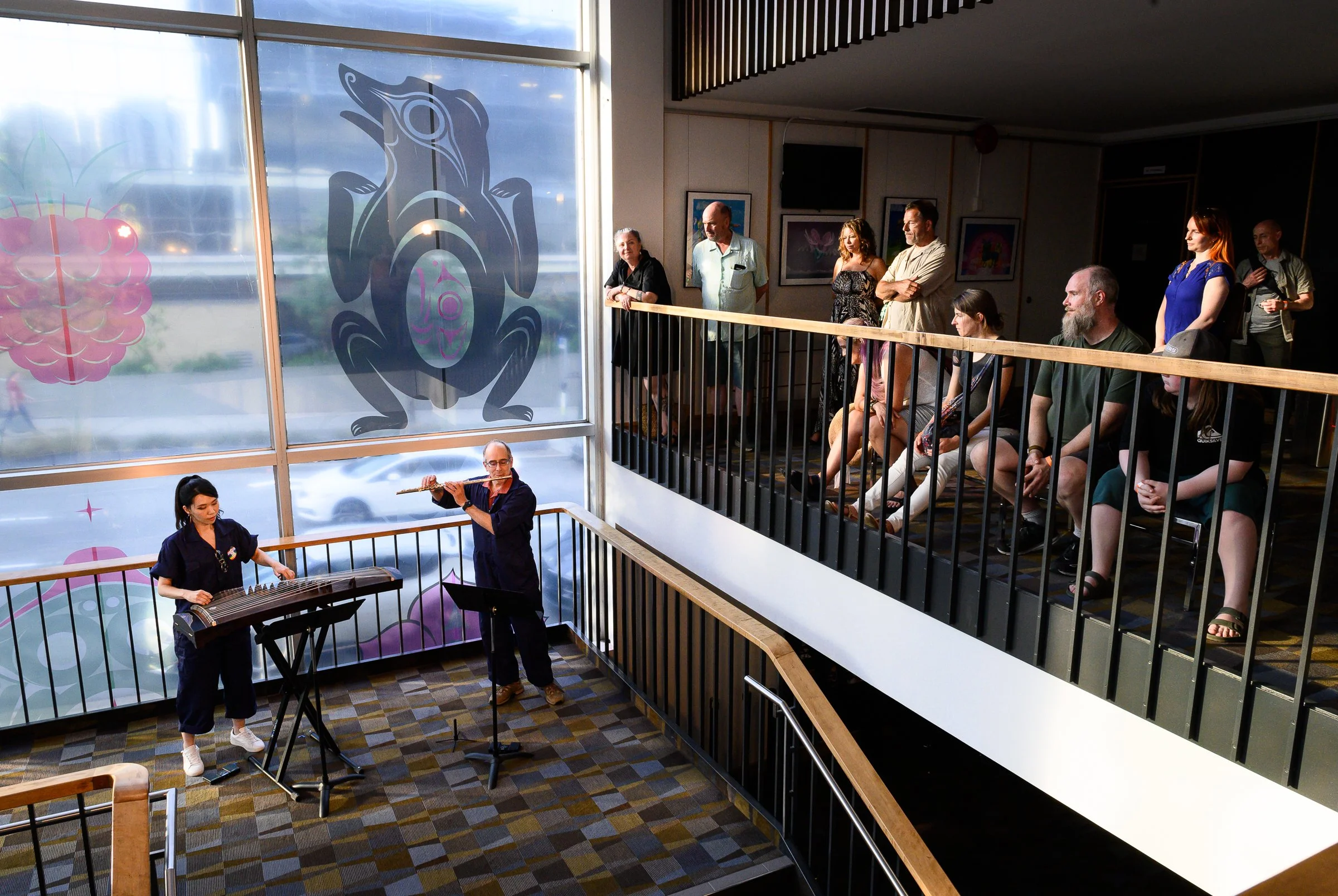 Another scene unfolds within the lobby’s glass-walled stairwell, overlooking zheng player Hsieh and flutist Bortolussi, who again urge us to hum and sing. Effective nods of encouragement and steady eye contact from the performers allow the audience to feel comfortable engaging in the music-making.