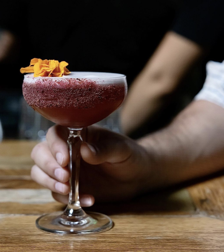Honey Salt bar leader Alper Fonte is of Mexican descent, and this cocktail is an homage to the holiday that’s near and dear to him. Made with mezcal, mandarin syrup, Aperol, and lemon juice with a charcoal rim, the drink has an orange hue as a nod to the colour of the path people create to make offerings on Día de Los Muertos; marigolds guide spirits to their altars with their vibrant shade and fragrance. The charcoal rim represents getting to the “other side”. The cocktail comes together with Mezcal, a signature spirit of Mexico, while Aperol gives it a hint of sweetness to represent calavera, or sugar candy skulls.