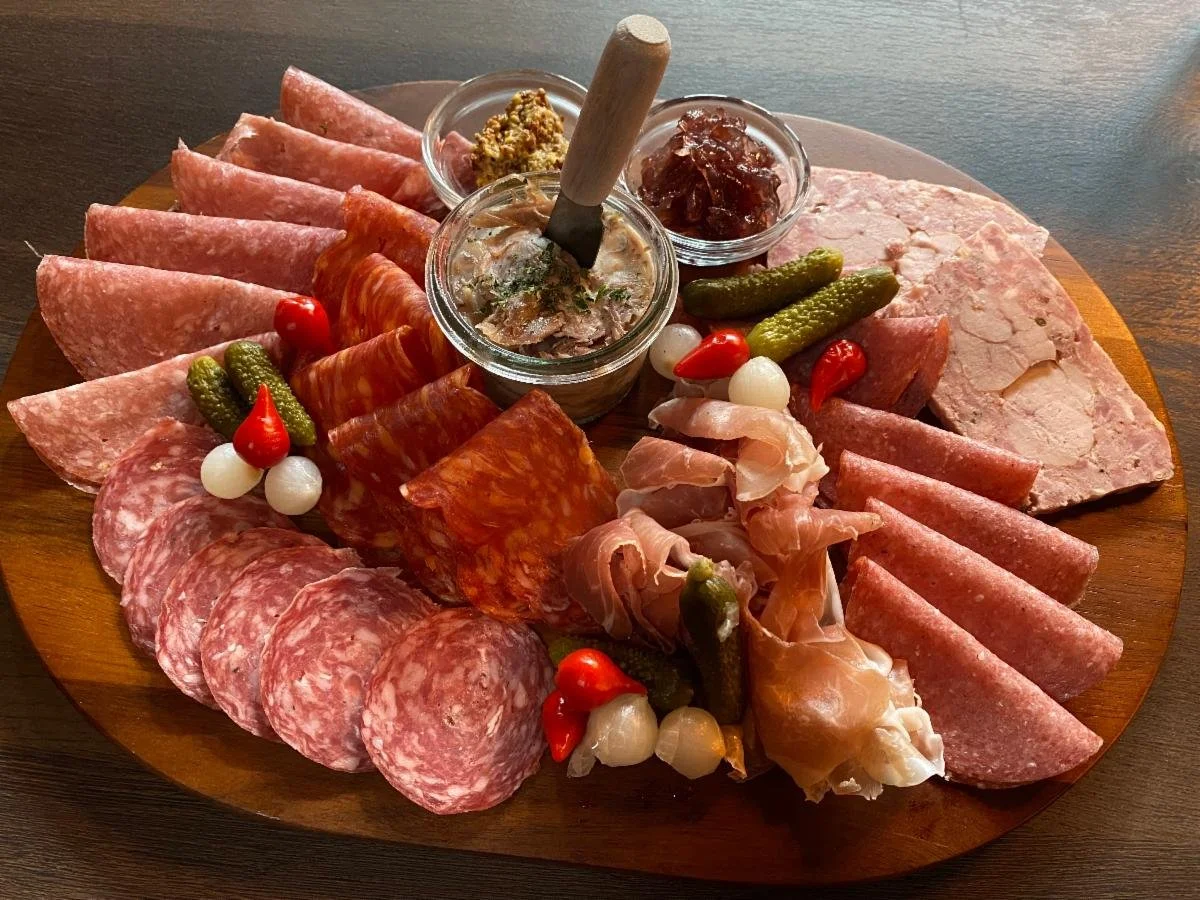 There are other boards to choose from, with the rest of the menu featuring classics like French onion soup; garlicky escargots Bourguignonne with parsley and Ricard butter; lobster bisque; Sauternes-marinated foie gras terrine; and steak frites—a 35-day dry aged 12-ounce ribeye—with peppercorn sauce or herb butter.