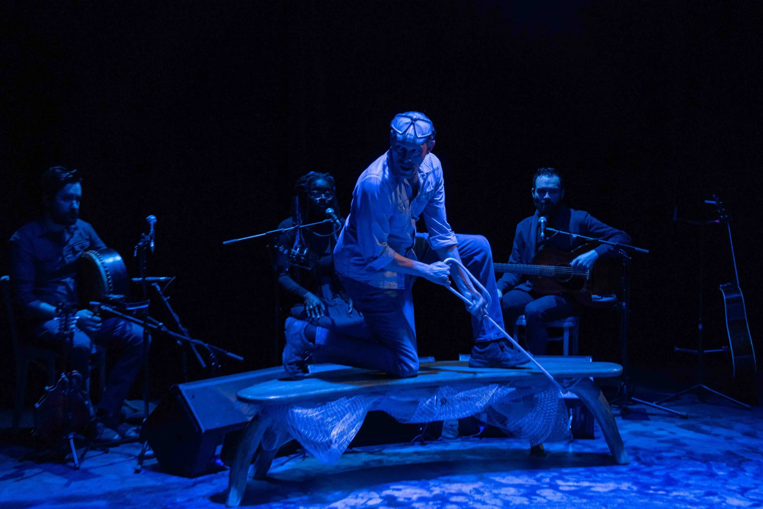 Most of our work starts with a conceptual design; we usually have at least a preliminary idea of what the visual metaphor for the story will be. In this case, during early drafts I imagined a giant whale skeleton hung above the stage, and actors on flies that seem to float and bob above it. It was only when we did a workshop presentation of the script and score in 2016, and saw the audience reaction, that we realized that those bells and whistles were not necessary.
