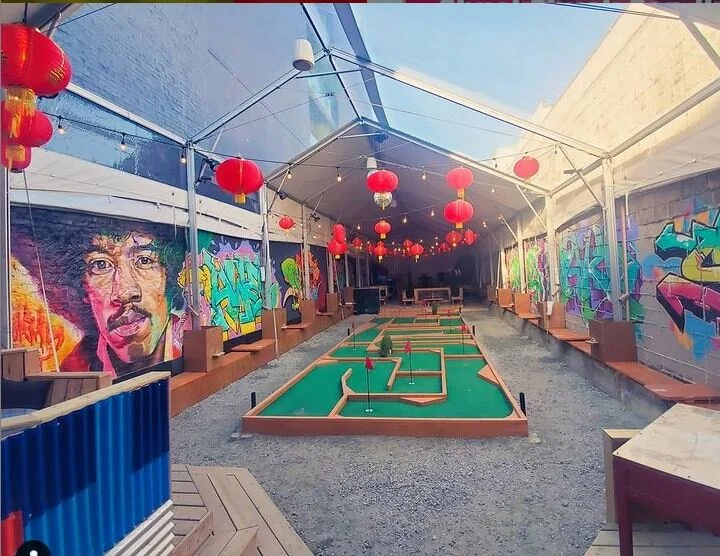 Several local artists adorned the walls with graffiti, with @form_ske painting the Jimi Hendrix mural. Fire tables atop custom-built wooden decks went in, and so did a glittering disco ball. There are lanterns hanging from the tent for Lunar New Year, and—get this!—a mini-putt course. (The course is currently closed due to public-health restrictions. GM Keenan Hood is hoping it can reopen soon. When it was up and running, people played by donation, with all funds going to rotating local charities.)