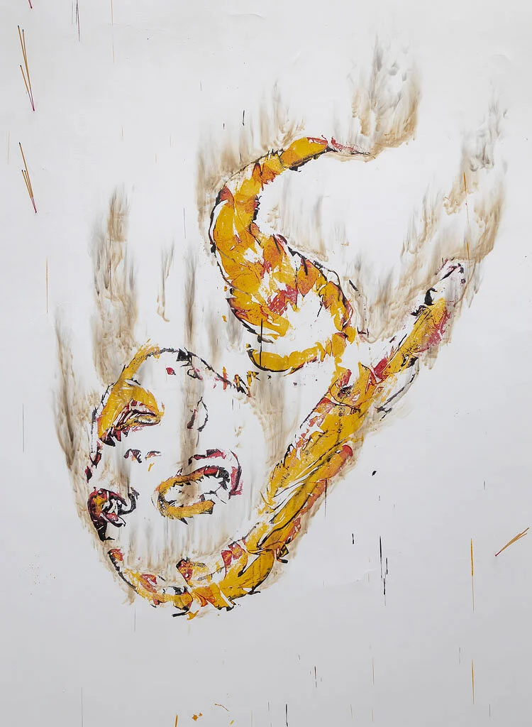 “The paper is like a corpse and the spirit has transferred to the wall,” he explains, standing surrounded by the bloodlike drips of calligraphy ink and acrylic paint along the rotunda’s baseboards, hundreds of long, burned-down matches littering the floor.