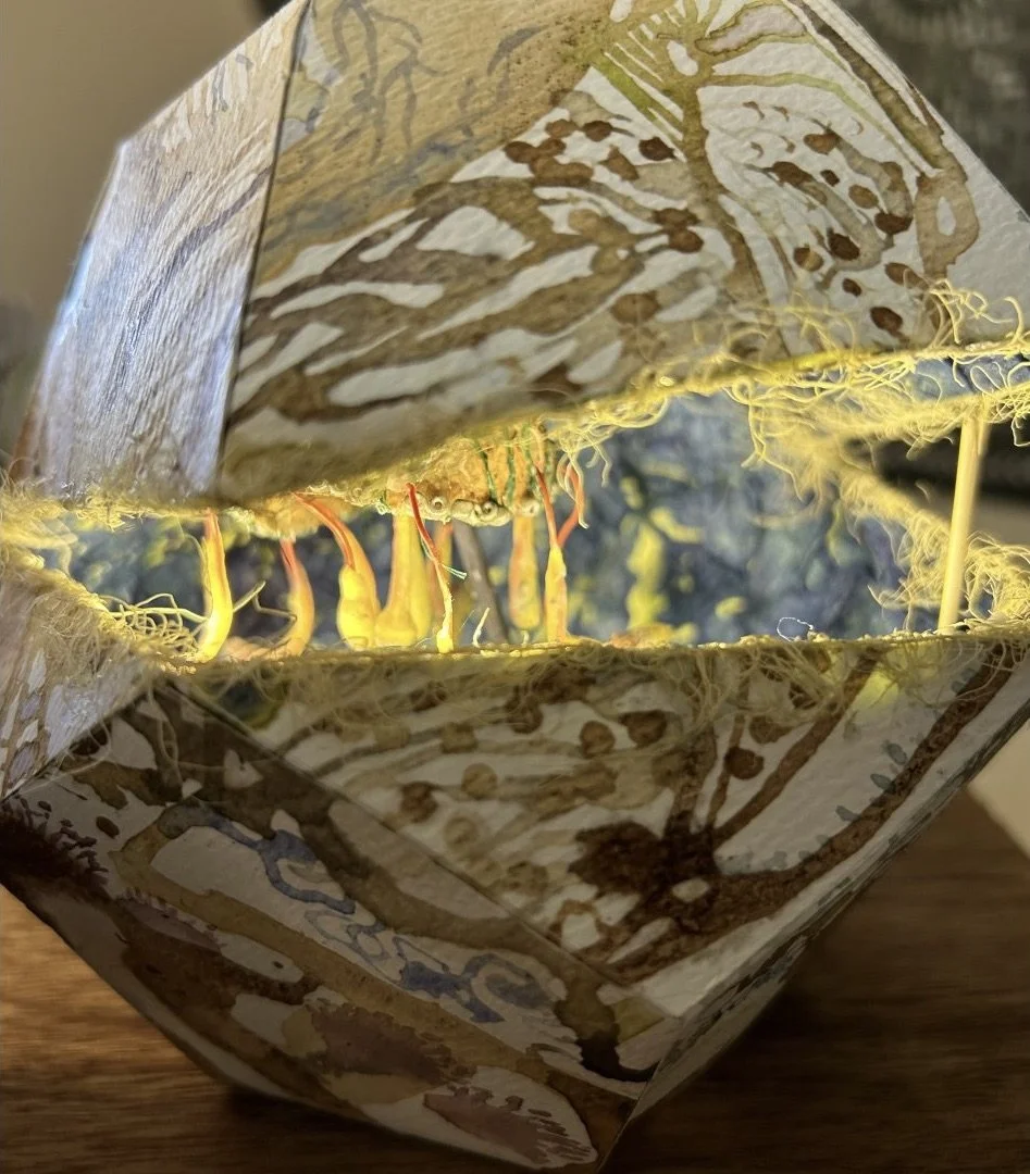 Detail view of Claire Moore’s Illuminated Pods (2025), paper, natural and plastic materials, motion sensor, and filament lights.