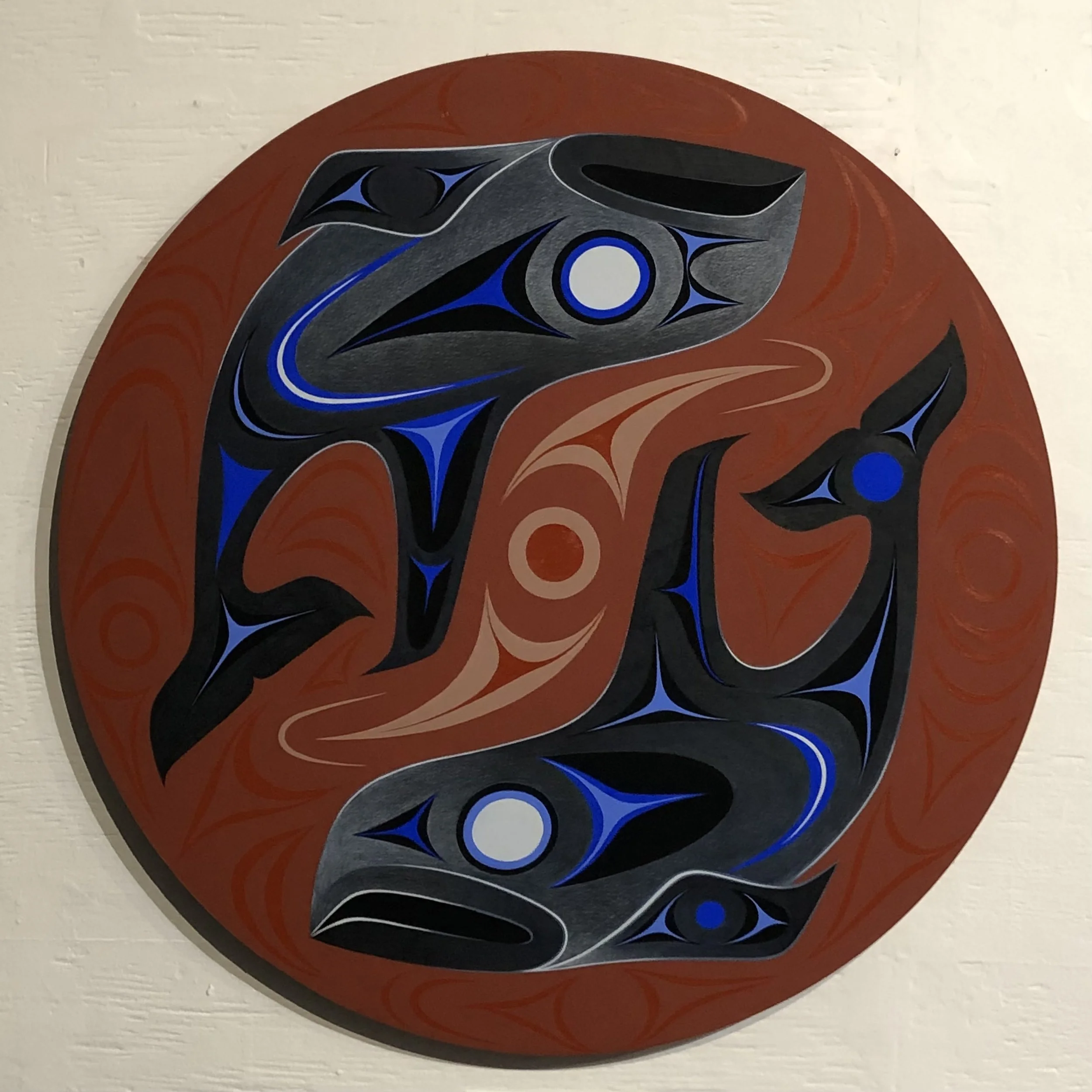 Local Salish artist Atheana Picha applies that ochre as a background for the striking cobalt blue of trader beads in the whorl-like-circular Blue-blackfish. The work refers to cultural wealth and exchange—the cobalt trader beads are thought to have arrived to the Indigenous people here from Russia or Czech Republic). So it’s fitting it features two mirror-image orcas, who also journey great distances.