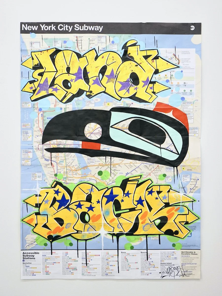 Other standout pieces include Bulpitt’s brand-new, wall-filling and multilayered graffiti piece, Untitled, featuring spray-painted “Land Back” script with formline ovoids and other figures. As Victor says, “It’s speaking to current and ongoing political matters that Indigenous folks face, in the face of growing cities and spiralling suburbs that encroach on Indigenous space.” The same goes for Bulpitt’s Raven Who Kept Walking, graffiti and formline emblazoning a New York Subway map.