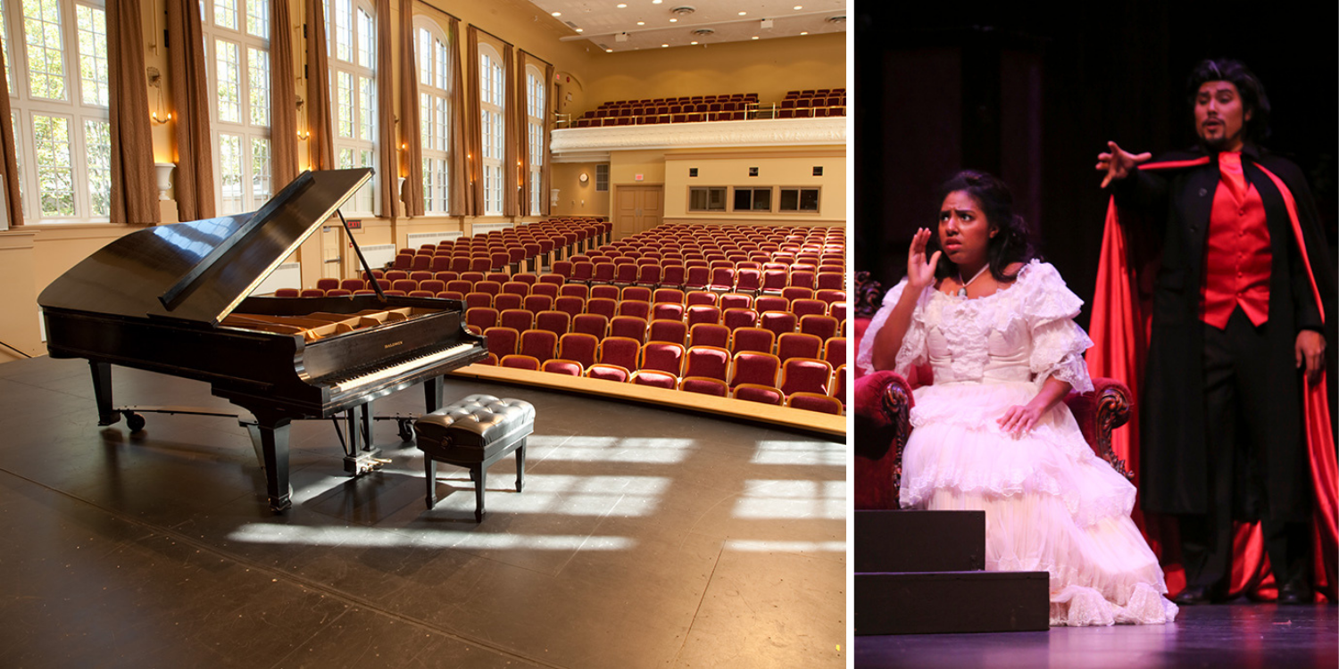 UBC’s Old Auditorium after its 2010 renovation (left, Brian Hawkes photo) and UBC Opera’s 2013 production of Tales of Hoffman (Tim Matheson photo).