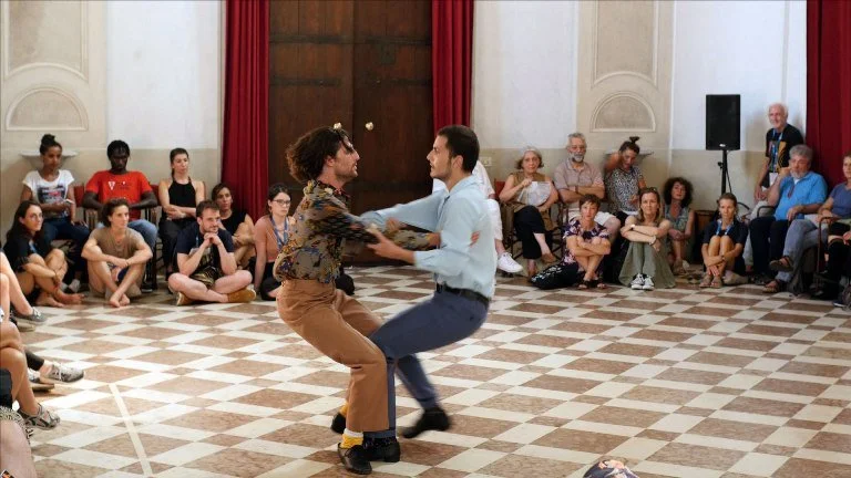 Sciarroni created Save the last dance for me in collaboration with Giancarlo Stagni, the Filuzziani dance master who found and studied those decades-old videos. The project consists of a performance by dancers Gianmaria Borzillo and Giovanfrancesco Giannini and a series of public workshops aimed at teaching people the dance and spreading the tradition.