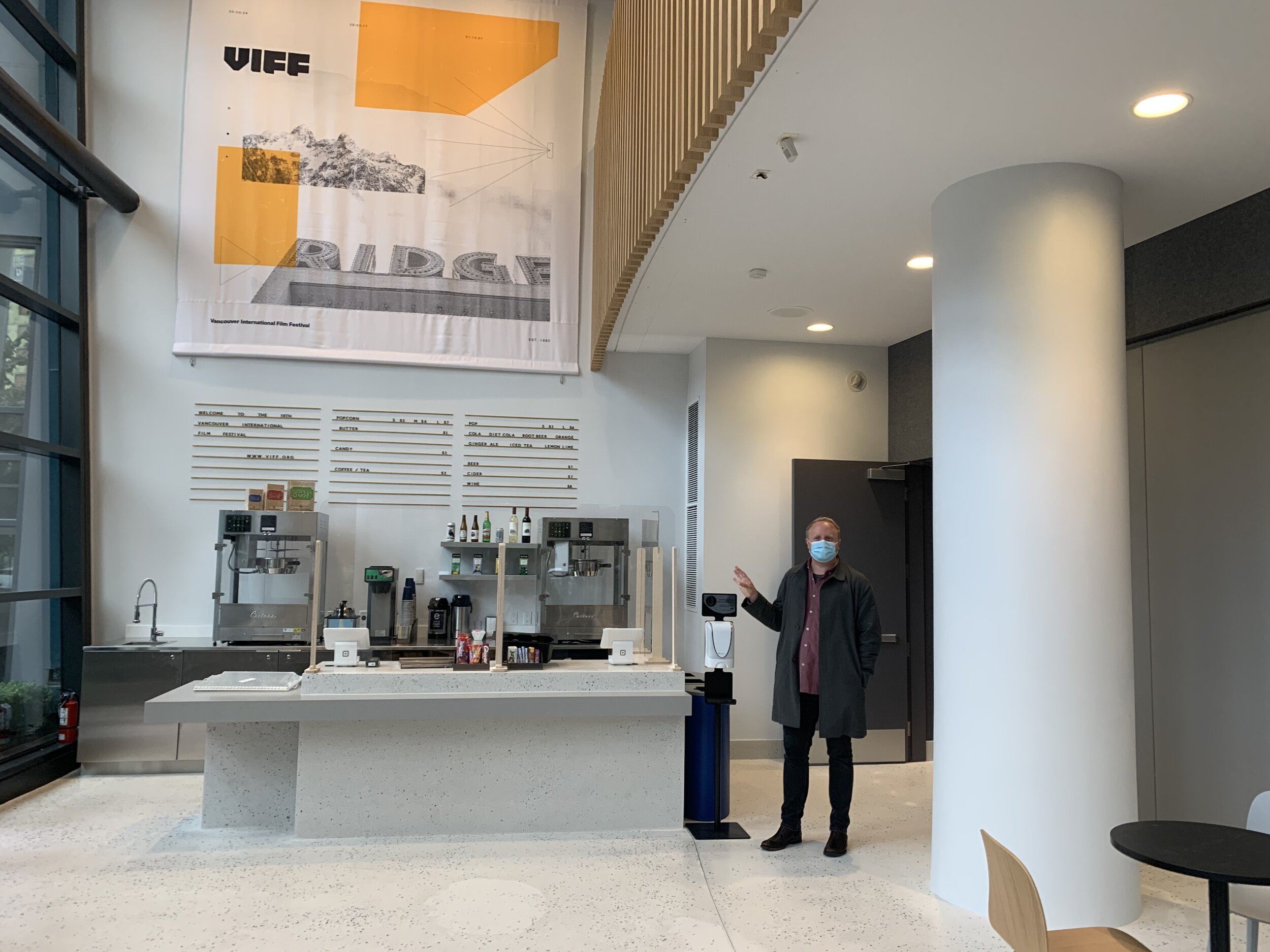 Kyle Fostner stands by the new concession, moved to the front window of the VIFF centre.