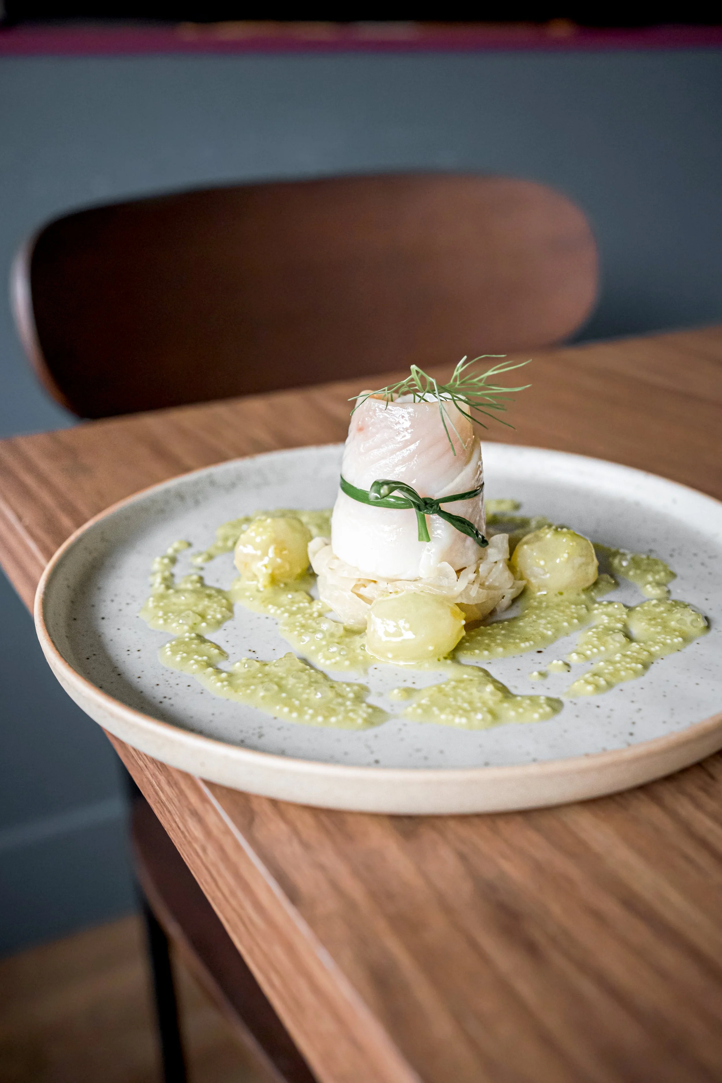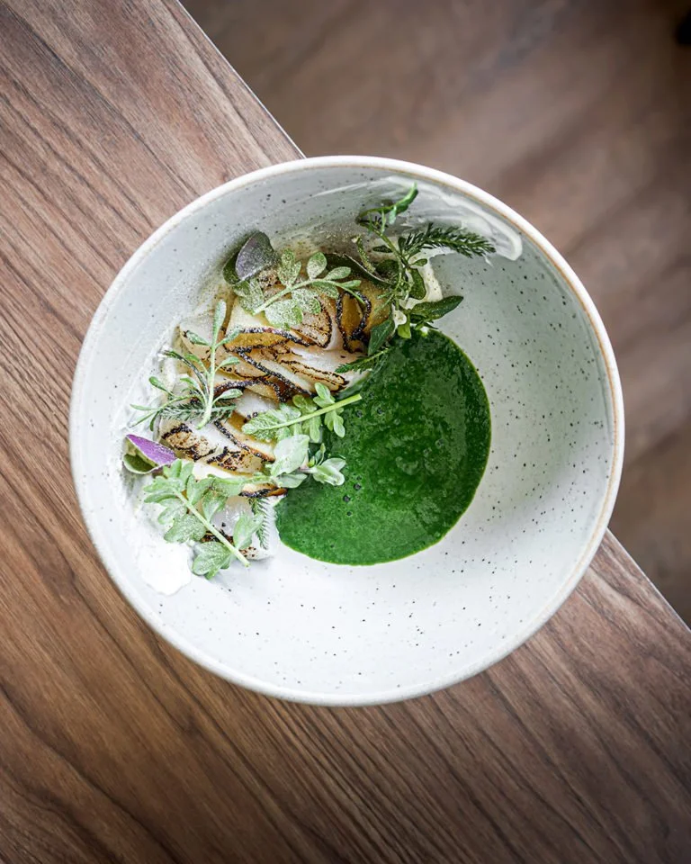 Highly technical and whimsical are words that describe his dishes, perhaps best exemplified by the scallop crudo, a stunner that takes up to three days to make. Kurtz brines the scallops lightly but first slow-roasts celery root and lacquers it with a glaze made of leek ash. The burnt leek tops form a powder that he mixes with sourdough miso, Fraser Valley honey, and brown butter. Dehydrated overnight, the celery root ends up with an intense, sweet flavour profile. Next comes a slightly sour crème fraiche made in house and a bright green, earthy Vichyssoise made of celery and spinach juice. After blanching the spinach and squeezing out all of the moisture, the leaves go into containers used to spin ice cream and made into a purée. That gets added to the celery juice.